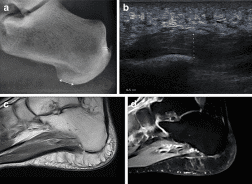 Imaging modalities. (a) Plain radiograph, (b) Thickening of the plantar fascia on ultrasound image, (c,d) MRI images to confirm plantar fasciitis at the origin4